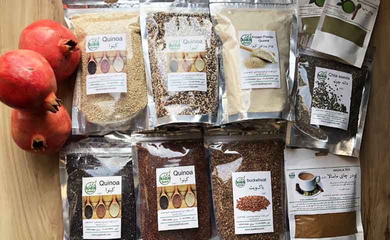 کینوا قرمز، کینوا سیاه، دانه چیا، پودر پروتئین کینوا، باکویت: 250گرمی کینوا سه رنگ 500گرمی، پودر ماچا 20 گرمی، چای ماسالا 100 گرمی