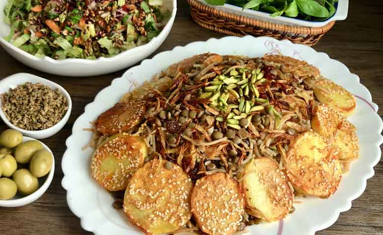 وقتی رشته عدس را داخل دیس کشیدید، پیاز داغ و کشمش تفت داده شده را روی آن بریزید.