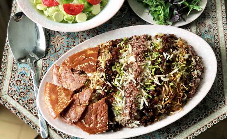 سپس مخلوط پیاز داغ و کشمش را روی آن بریزید و با خلال پسته و بادام تزئین کنید.