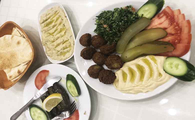 در عکس زیر مُطَبل، فلافل، حُمُص و تبوله هم در کنار دلمه دیده می شود.