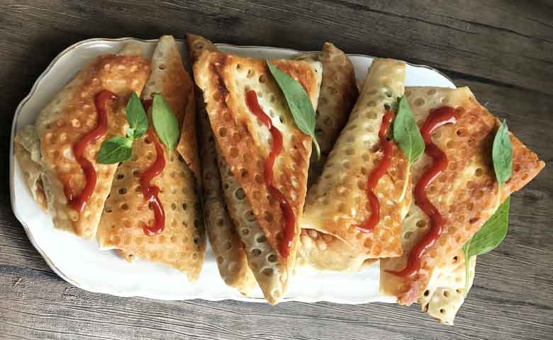 مواد میانی را در خمیری نازک یا برشی از نان لواش به صورتی مثلثی پیچیده و در روغن داغ سرخ میکنند.